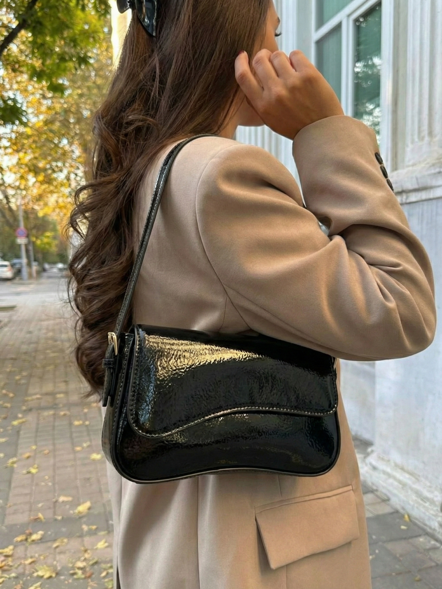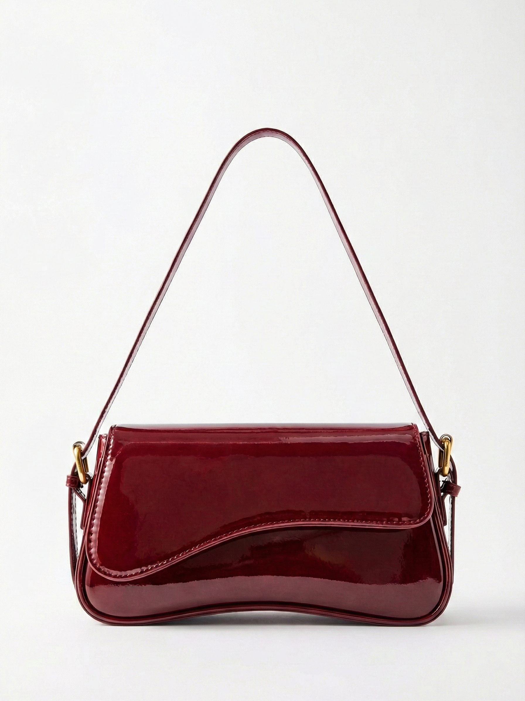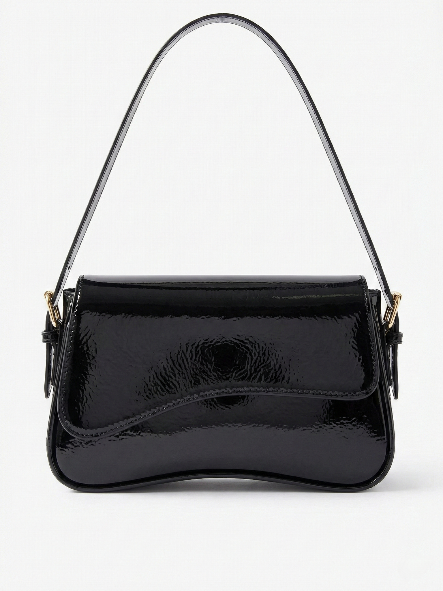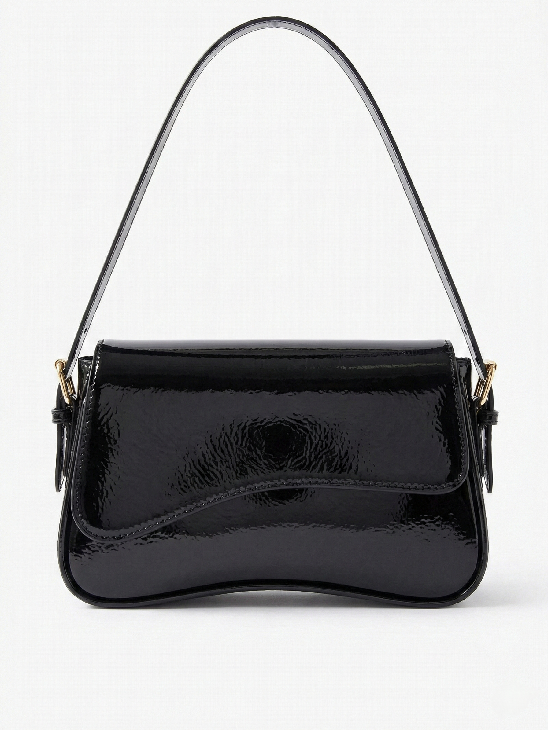 The Amina Shoulder Bag features a sleek curved silhouette with a high-shine patent finish and a structured flap design. Designed to elevate evening and statement styling, it combines a compact shape with a refined shoulder strap and polished gold-tone hardware for a bold yet sophisticated look. The glossy surface adds instant impact, making it the perfect finishing touch for dinners, events, and elevated night-out outfits.