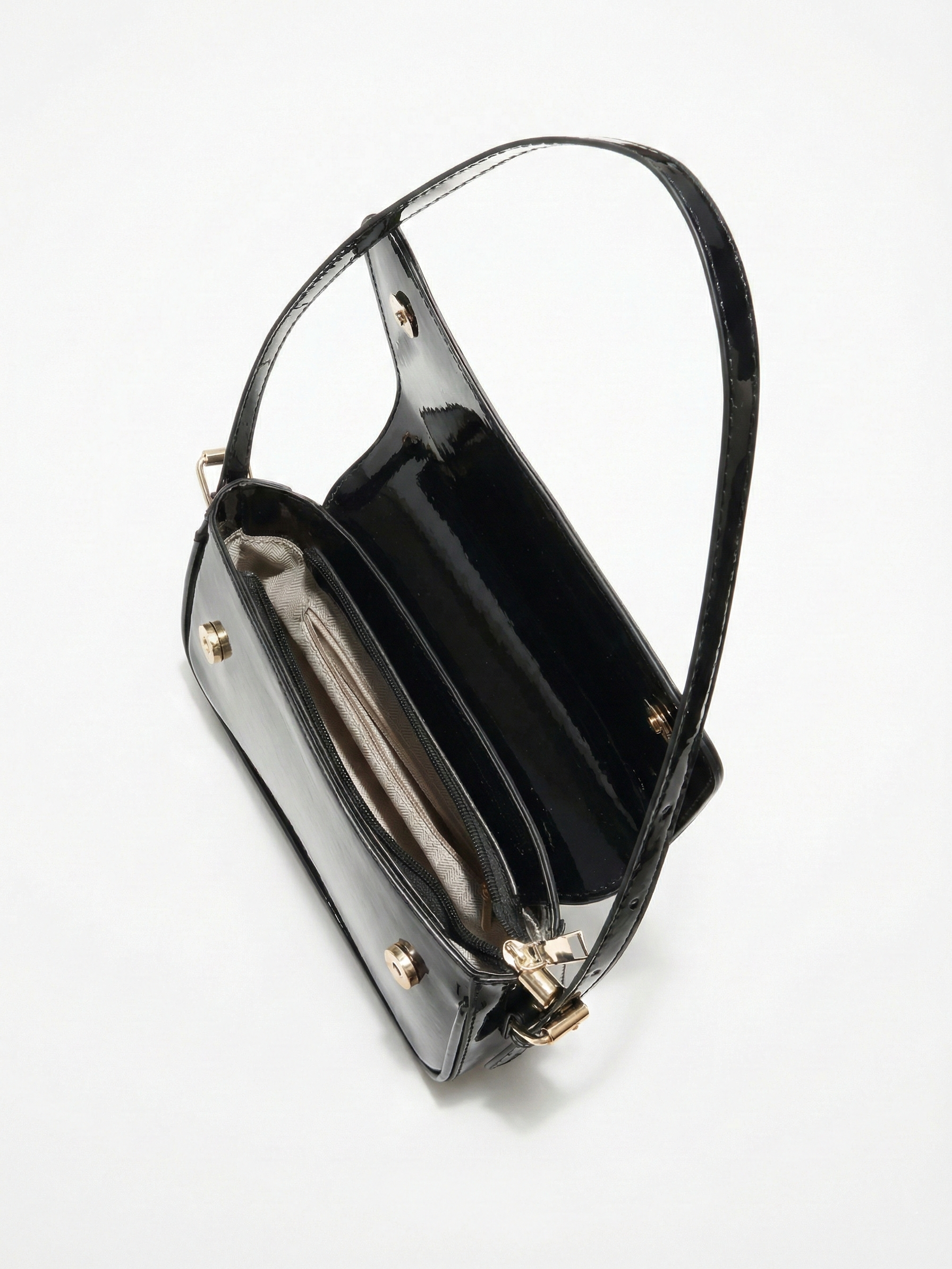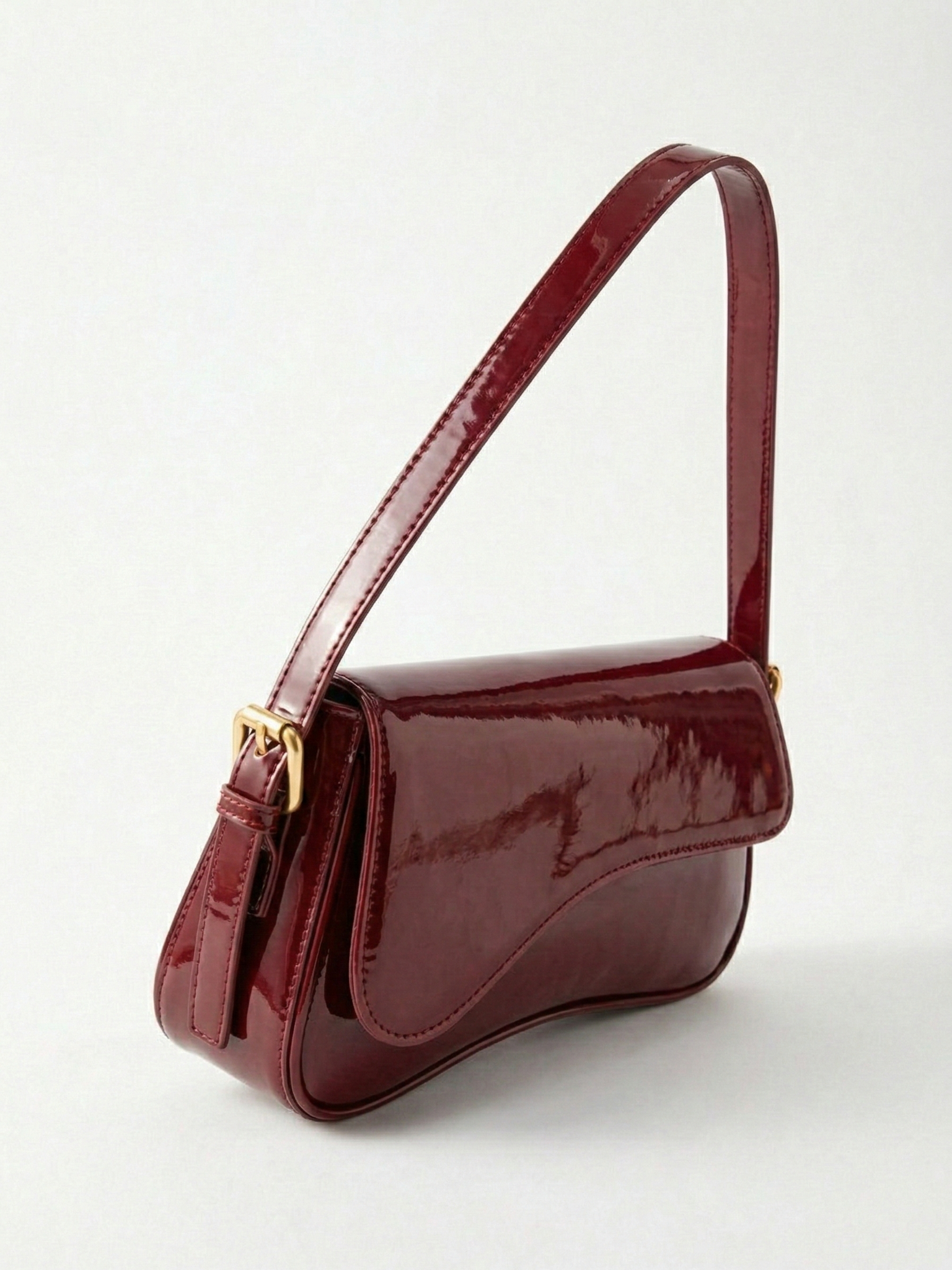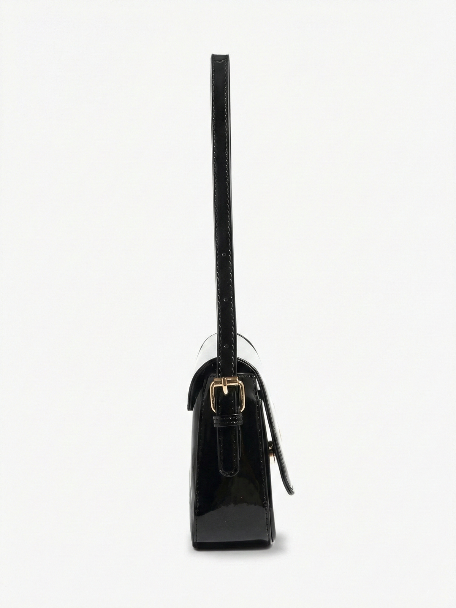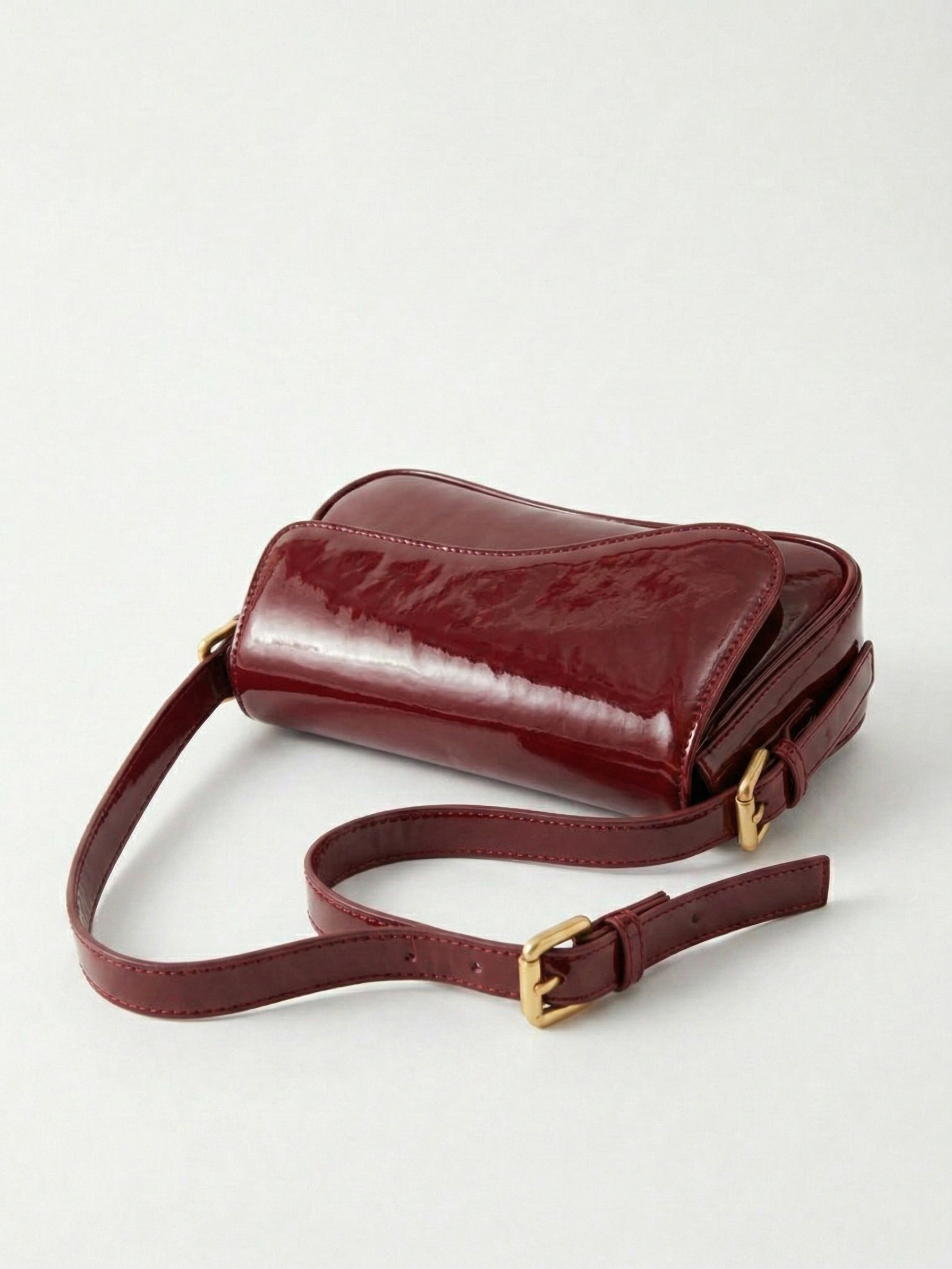 The Amina Shoulder Bag features a sleek curved silhouette with a high-shine patent finish and a structured flap design. Designed to elevate evening and statement styling, it combines a compact shape with a refined shoulder strap and polished gold-tone hardware for a bold yet sophisticated look. The glossy surface adds instant impact, making it the perfect finishing touch for dinners, events, and elevated night-out outfits.