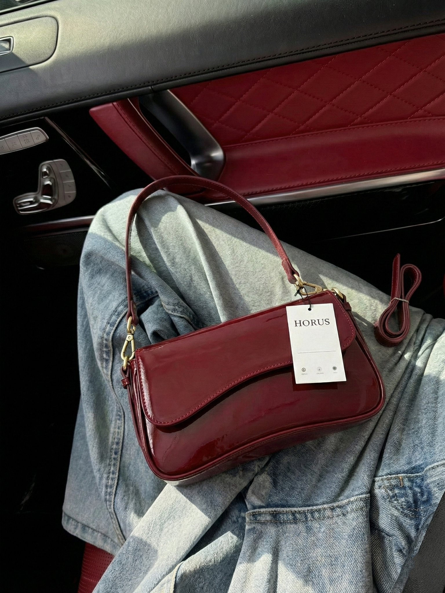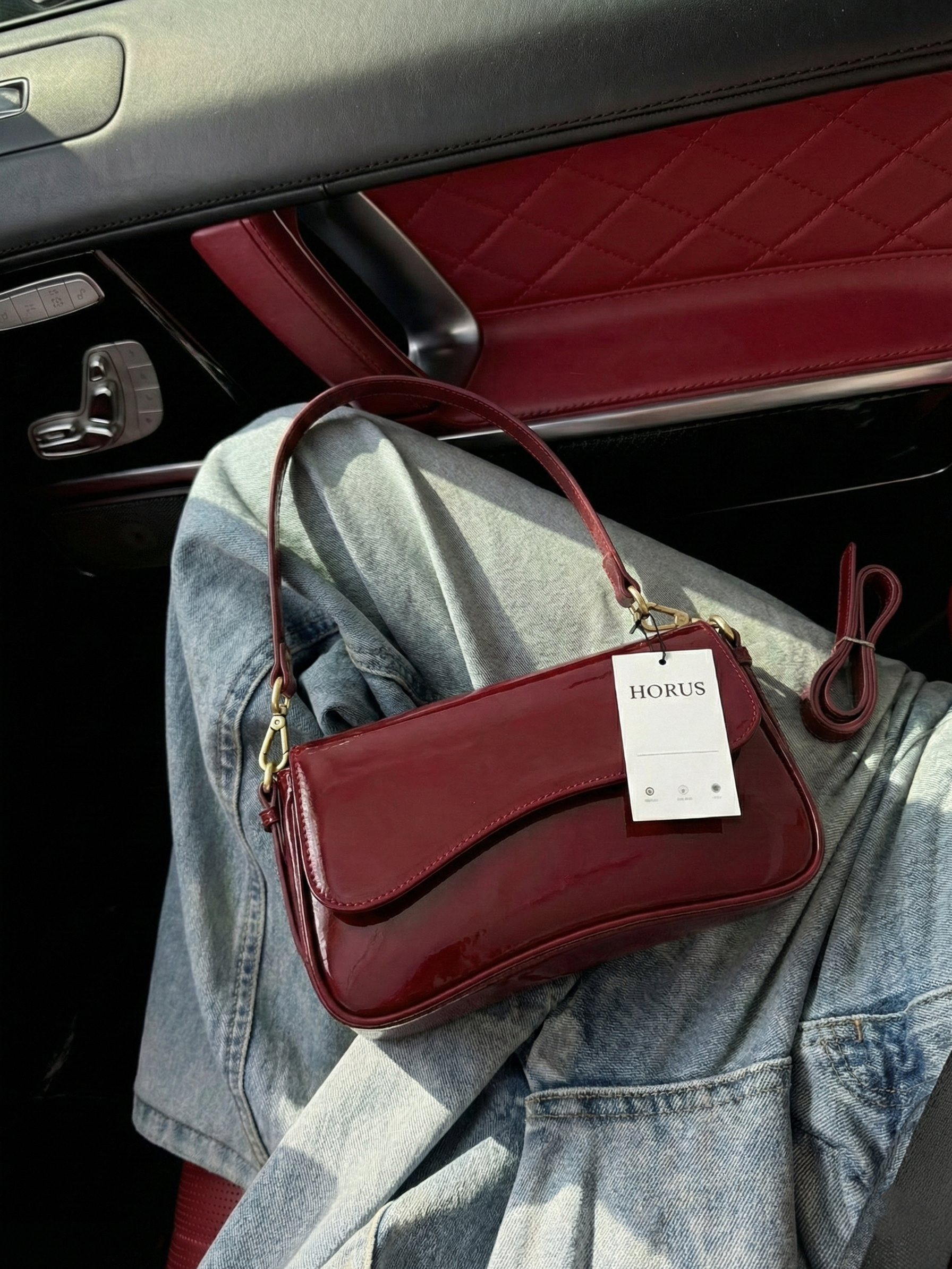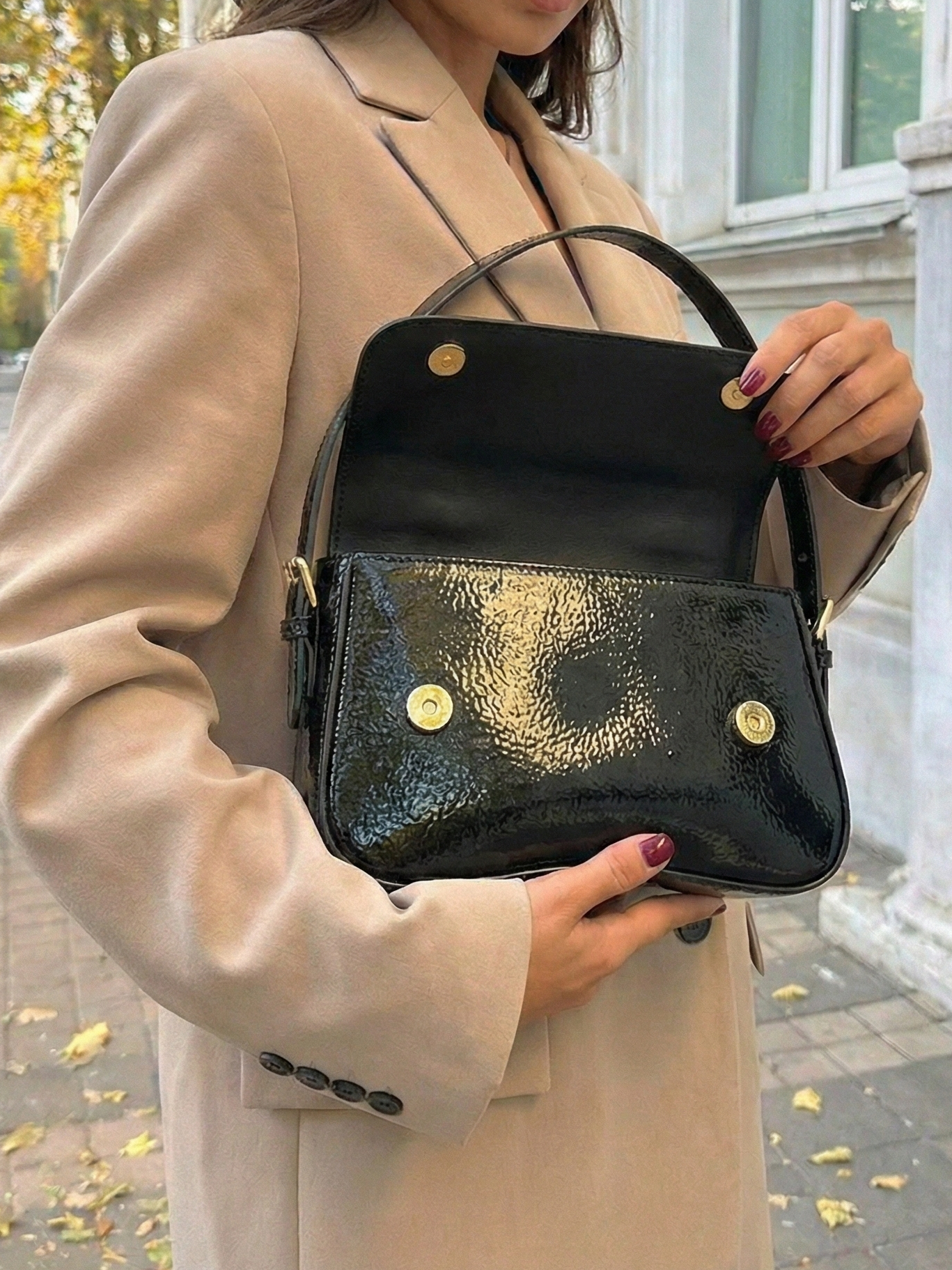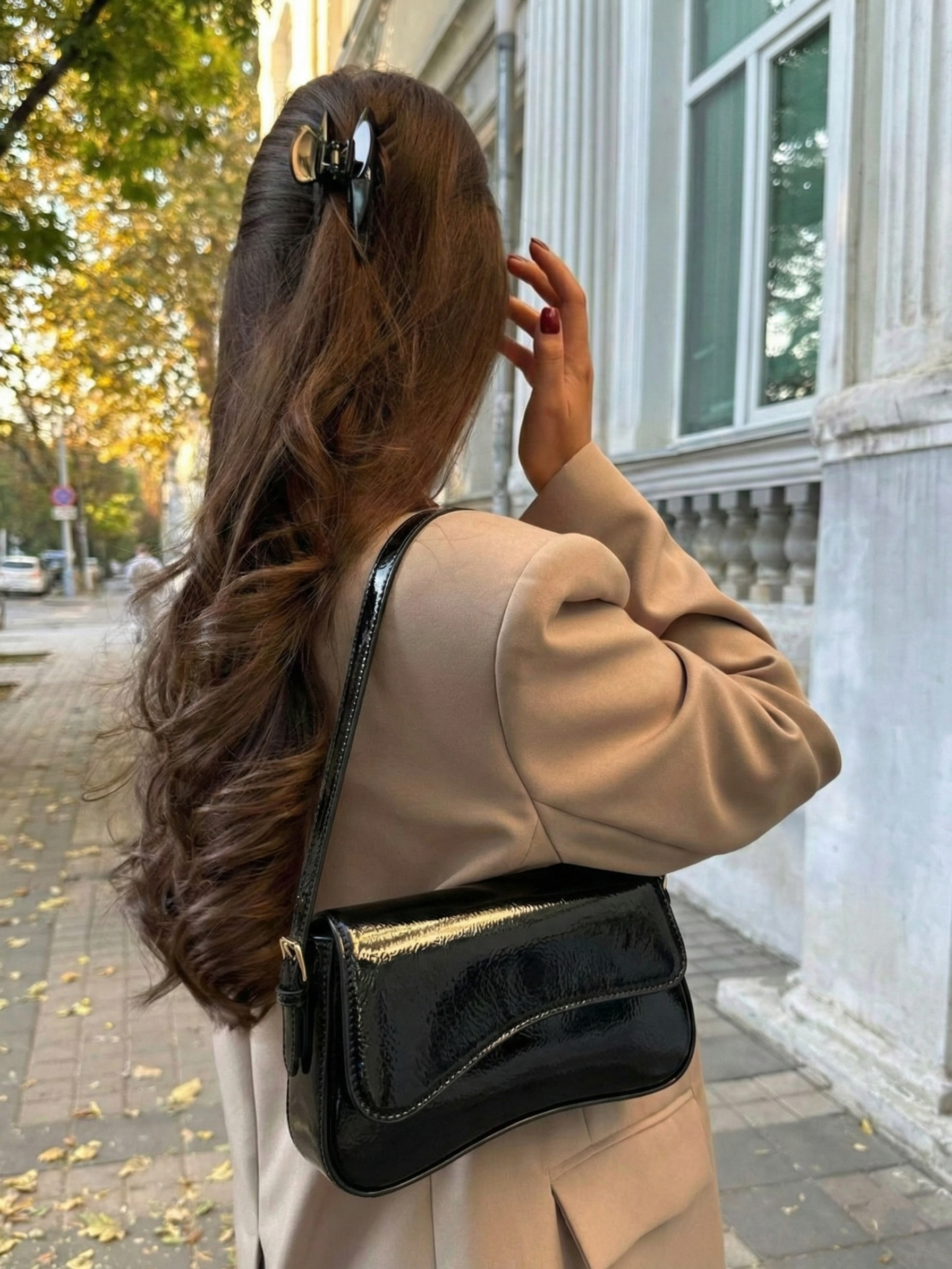 The Amina Shoulder Bag features a sleek curved silhouette with a high-shine patent finish and a structured flap design. Designed to elevate evening and statement styling, it combines a compact shape with a refined shoulder strap and polished gold-tone hardware for a bold yet sophisticated look. The glossy surface adds instant impact, making it the perfect finishing touch for dinners, events, and elevated night-out outfits.